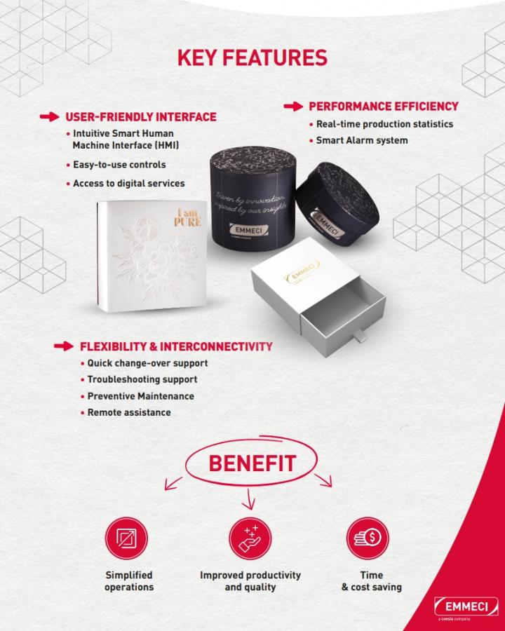 Emmeci is redefining luxury packaging production with its intuitive, user-friendly digital platform, designed to deliver unparalleled precision, efficiency, and flexibility. Featuring services such as operator assistance, remote support and predictive maintenance, it eliminates costly downtime and ensures a seamless production flow, empowering manufacturers to meet the dynamic demands of the luxury market.
